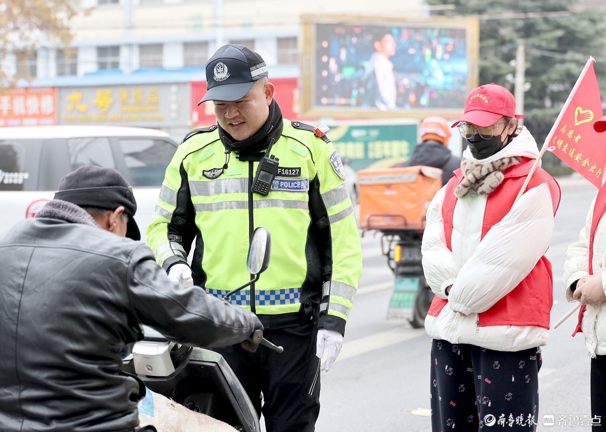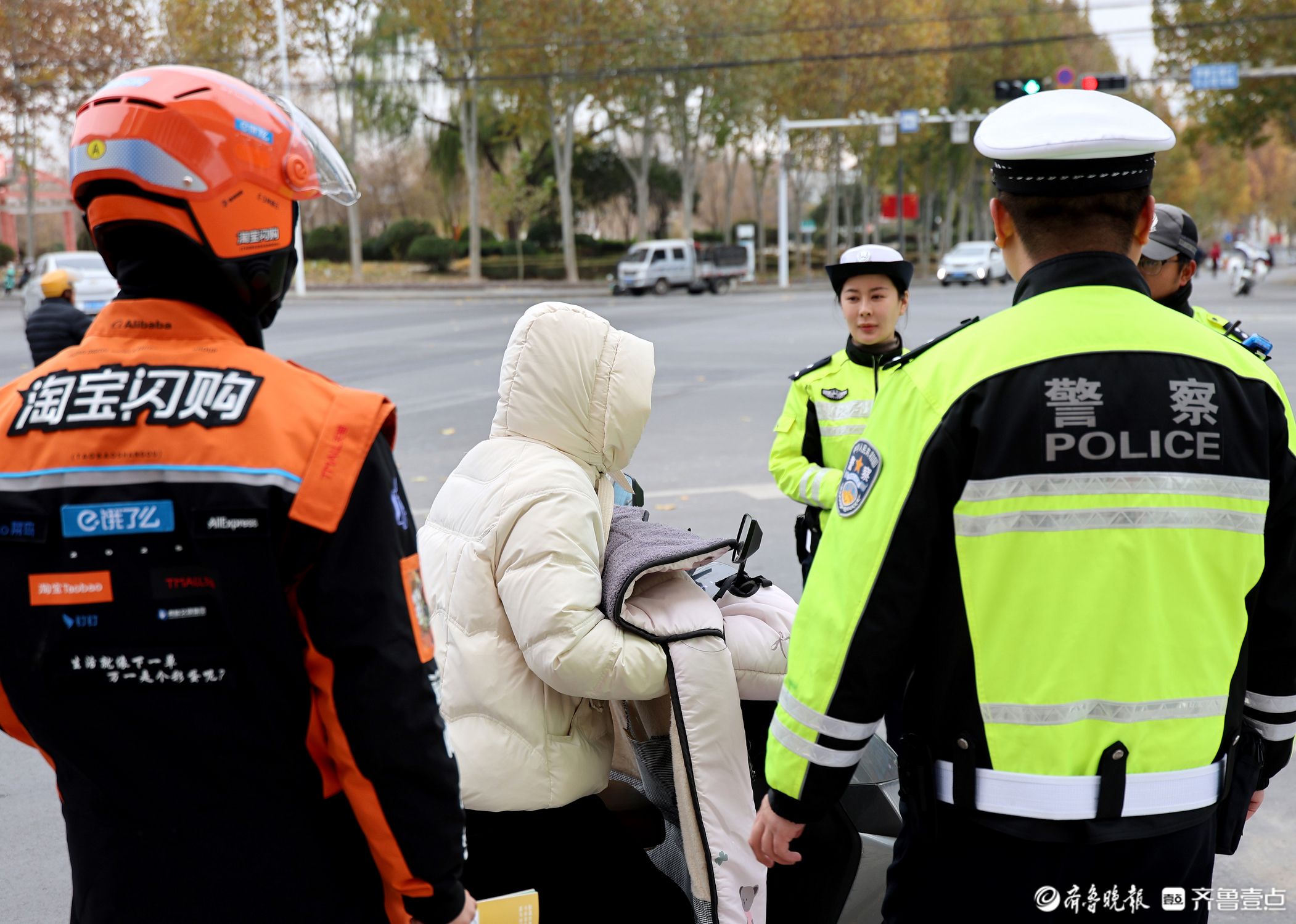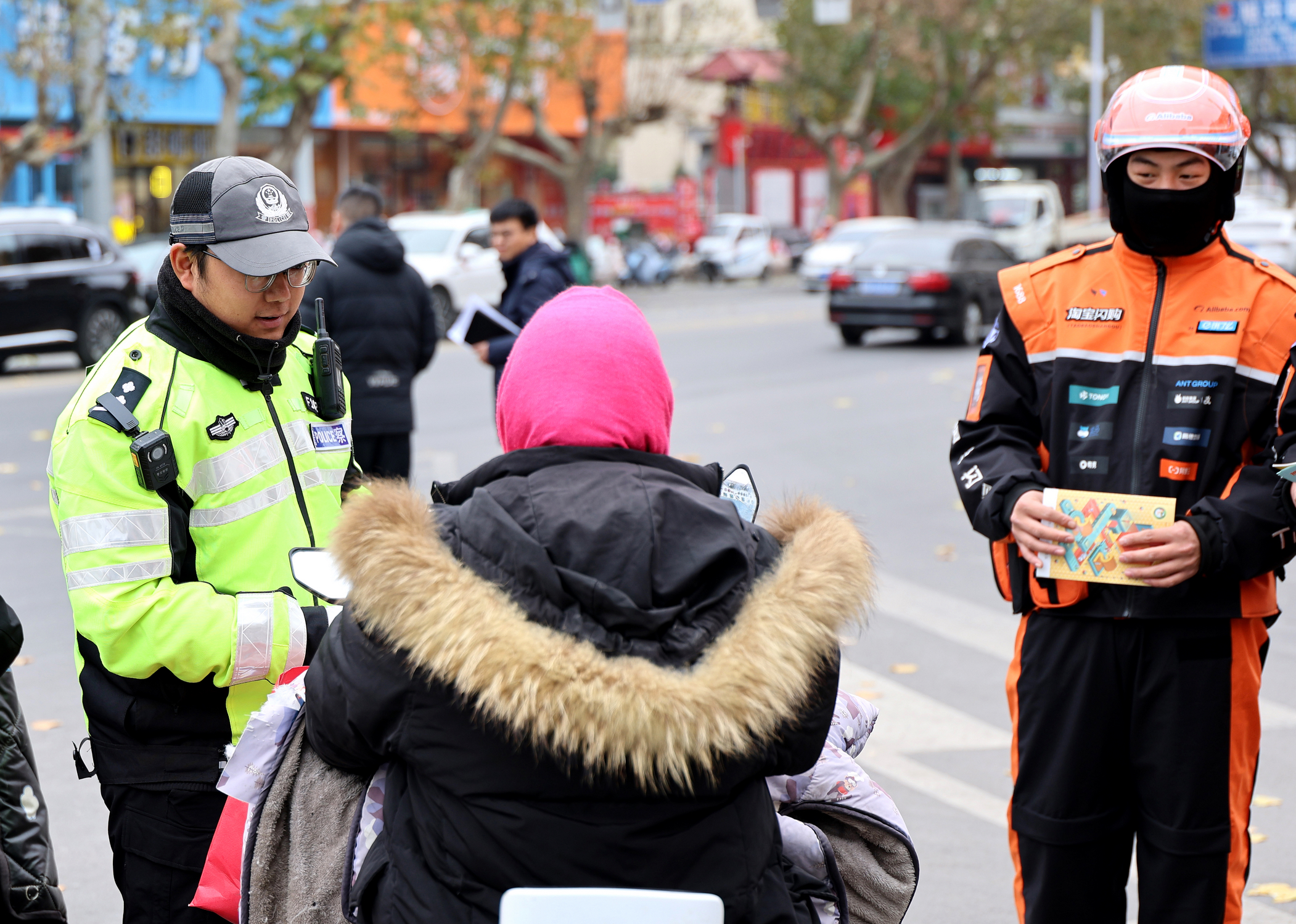 12月2日全国交通安全日,临沂市蒙阴县公安局交通管理大队以“文明交通 礼行天下”为主题开展交通安全宣传活动。宣教民警携手美团和饿了么头盔示范骑手,在城区主要街道开展电动车骑乘头盔佩戴规范纠治工作,通过面对面宣讲,现场引导等方式,向市民普及交通安全法律法规与文明出行常识,全力营造安全有序文明的道路交通环境。 公茂栋 李敬轩 摄