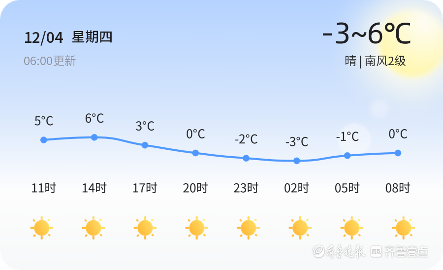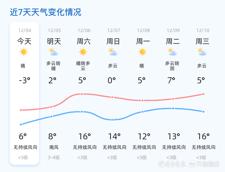 今天是12月4日,星期四,农历十月十五。济南市迎来晴朗天气,气温在-3°C到6°C之间。各区天气状况良好,南风2级,空气湿度34%,PM2.5指数为62,空气质量良好。市民朋友们可以享受这晴朗的一天,但需注意早晚温差较大,及时增添衣物。明天气温将有所上升,预计最高气温将达到8°C,最低气温2°C,天气为多云转晴,风力稍有增强,南风3-4级。未来三天,济南市天气以晴到多云为主,气温将有明显波动,最高气温可达16°C,最低气温仍为-3°C。建议市民根据天气变化及时增减衣物,尤其是早晚时段,需注意保暖。此外,未来三天内,风力变化不大,但气温波动较大,市民朋友们需关注天气预报,合理安排出行和生活。
