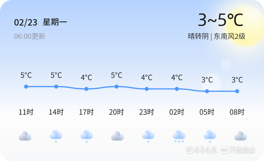 今天是2026年2月23日,星期一,农历正月初七。青岛市今日天气晴转阴,温度在3℃到5℃之间,东南风2级,空气湿度41%,空气质量良好(PM2.5为47)。市民朋友们,今日早晨气温较低,建议出行时增添衣物,注意保暖。由于天气转阴,部分时段可能出现零星小雨,提醒市民出行携带雨具,注意交通安全。