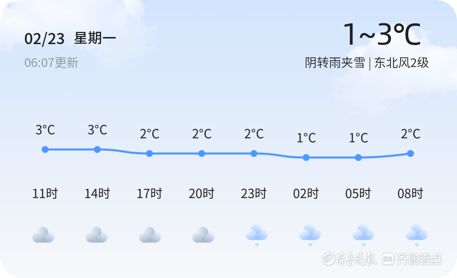 今天是2月23日,星期一,农历正月初七。威海市今日天气为阴转雨夹雪,气温介于1℃至3℃之间,东北风2级,空气湿度41%,PM2.5浓度为60,属于良级空气质量。今日天气阴雨,市民出行时建议携带雨具,注意防滑,确保行车安全。