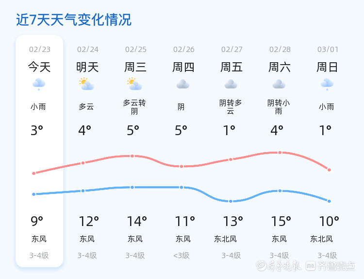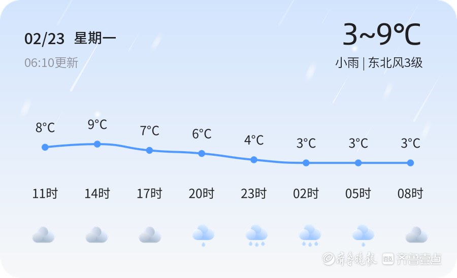 2月23日,星期一,农历正月初七,临沂迎来小雨天气,气温在3℃到9℃之间。今天早晨6时,临沂的气温为1.5℃,伴有小雨,风向东北风3级,空气湿度为46%,PM2.5指数为25,空气质量良好。各区的天气情况基本一致,均为小雨,气温在3℃到9℃之间波动。
