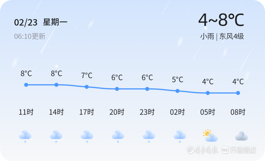 今天是2月23日,星期一,农历正月初七。菏泽市迎来小雨天气,气温在4℃至8℃之间,东风4级,空气湿度37%。当前空气质量为中度污染,PM2.5浓度为174微克/立方米,建议市民外出时佩戴口罩,减少长时间户外活动。降雨天气可能导致路面湿滑,提醒市民出行时注意交通安全,减速慢行。