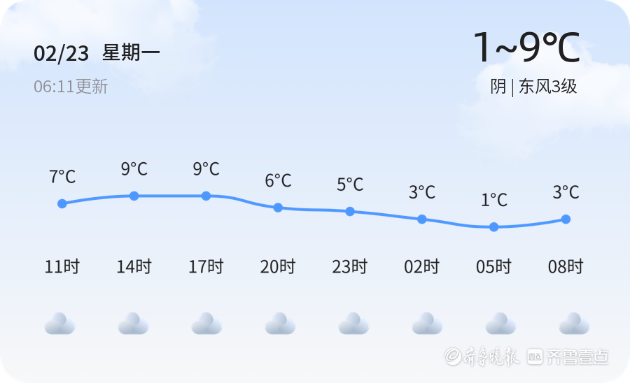 今天是2026年2月23日,星期一,农历正月初七。德州市今日天气阴沉,气温较低,最高气温9℃,最低气温1℃,风向为东风,风力3级,空气湿度32%,空气质量良好(PM2.5为50)。当前温度为1.3℃,阴天可能对市民出行带来一定影响。建议市民出行时携带雨具,注意保暖,尤其是早晨和夜间气温较低,驾车请注意路面湿滑,减速慢行。
