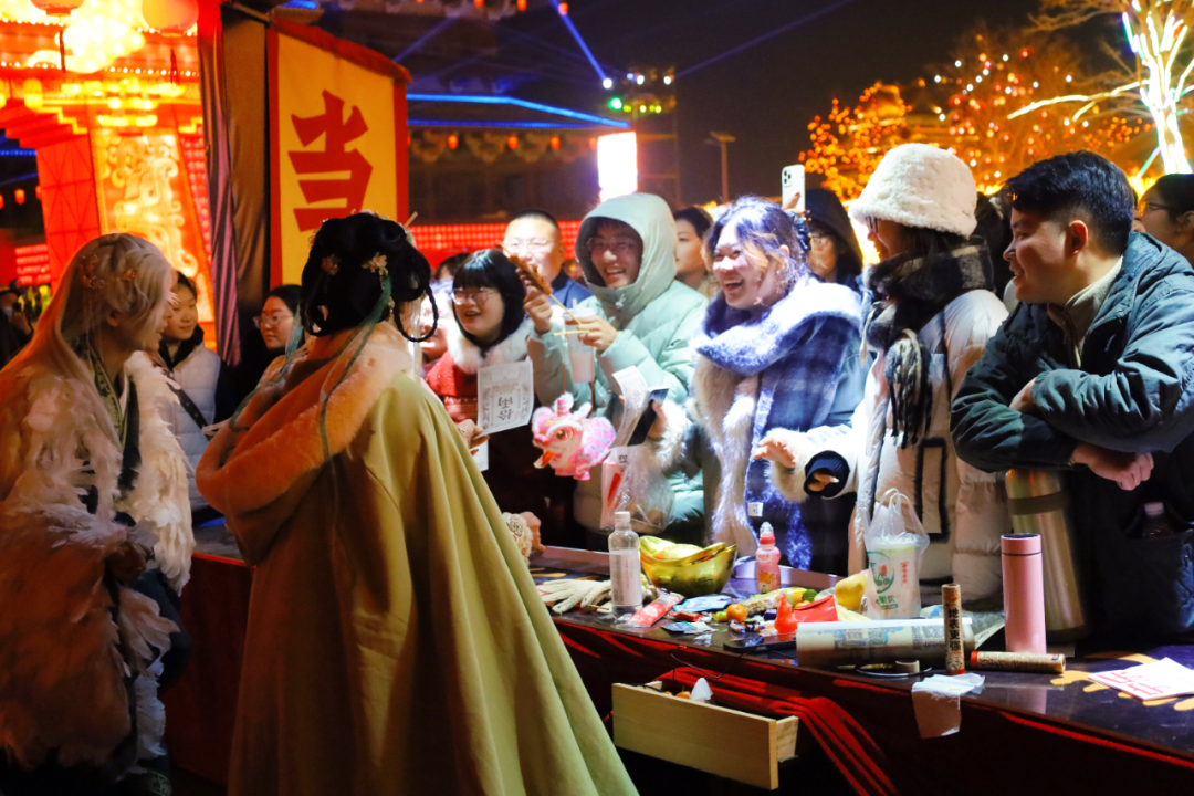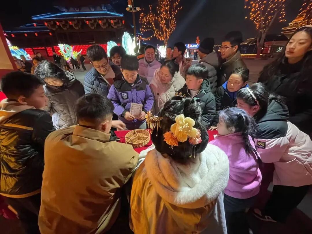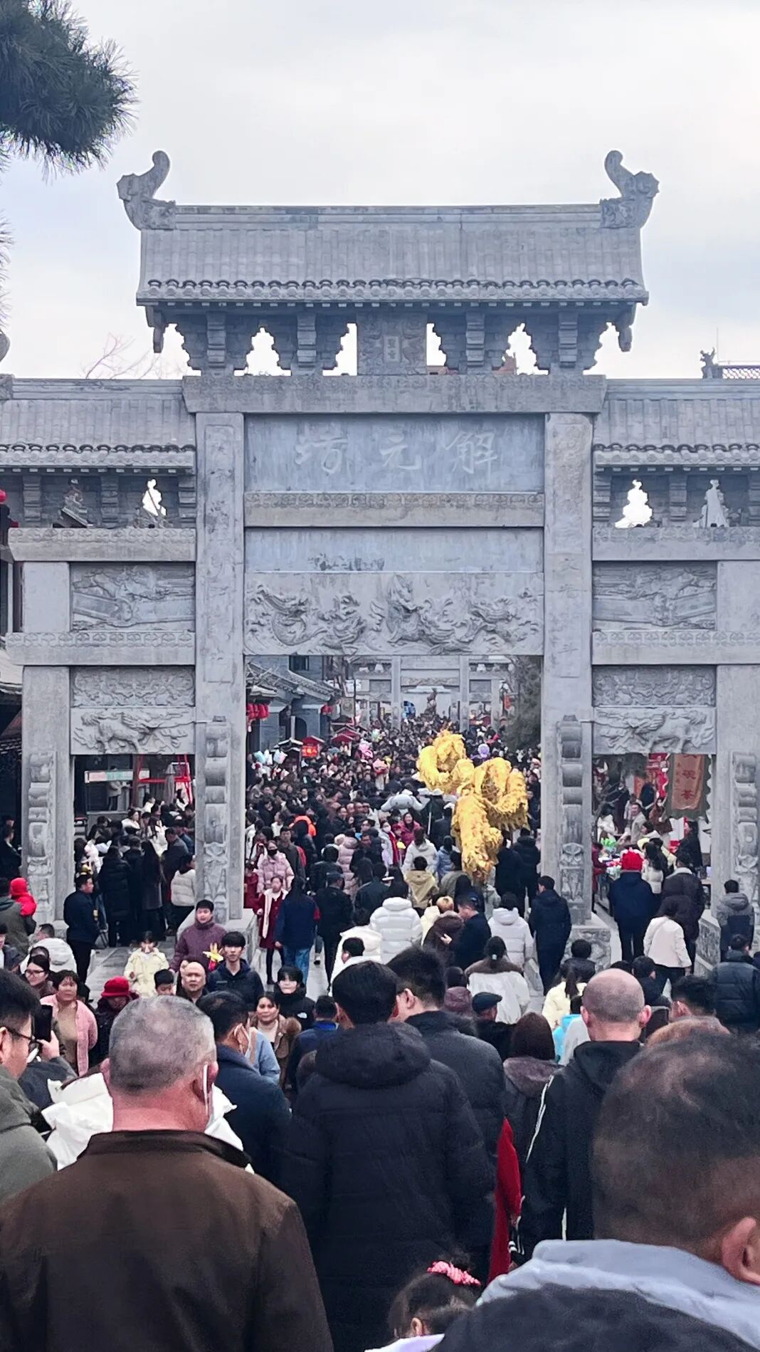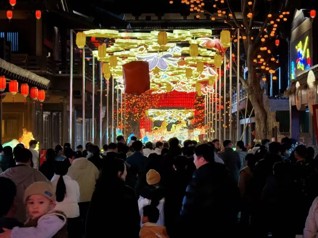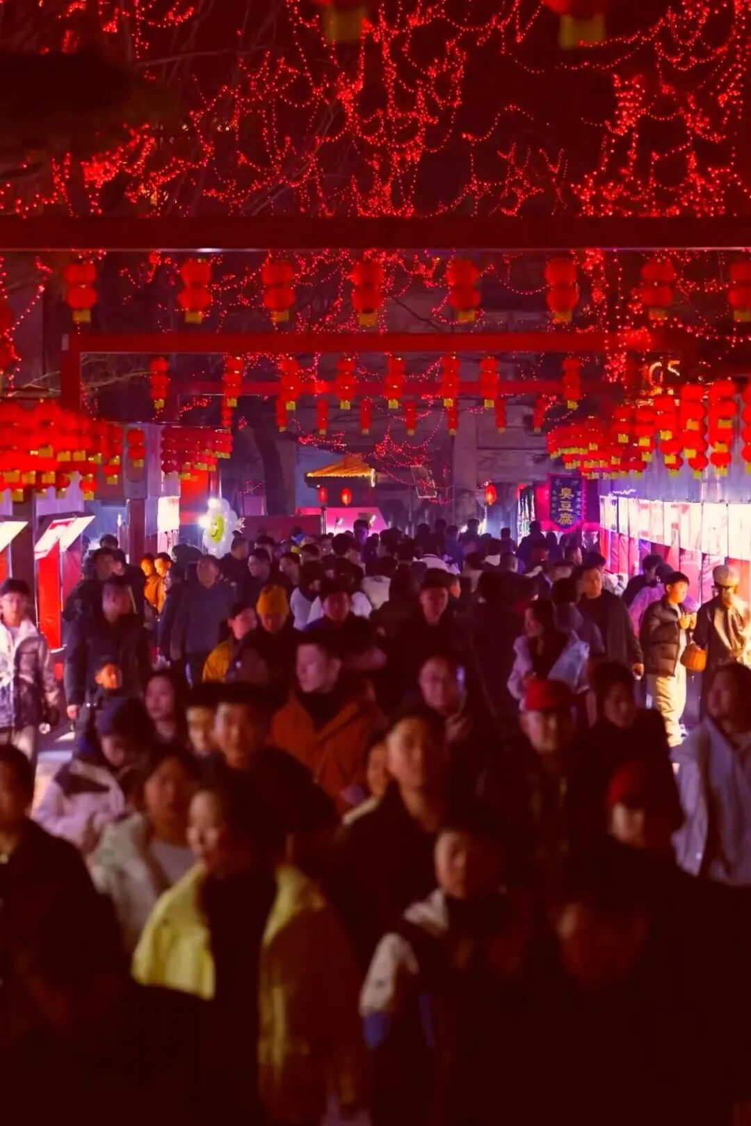 璀璨花灯与千年古建相映,厚重文脉与新春烟火相融,随手一拍都是国风大片。往来游客层层围拢、驻足拍照,热闹非凡。