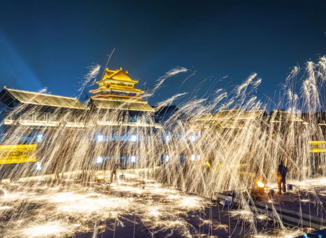 打铁花将气氛推向最高潮。匠人将滚烫的铁水奋力击向长空——“砰”的一声,金色铁花骤然炸裂,似万点流星簌簌坠落,与古城楼阁、璀璨灯火交相辉映。火树银花不夜天,流光溢彩夺目,引得全场游客阵阵惊呼、掌声不断。