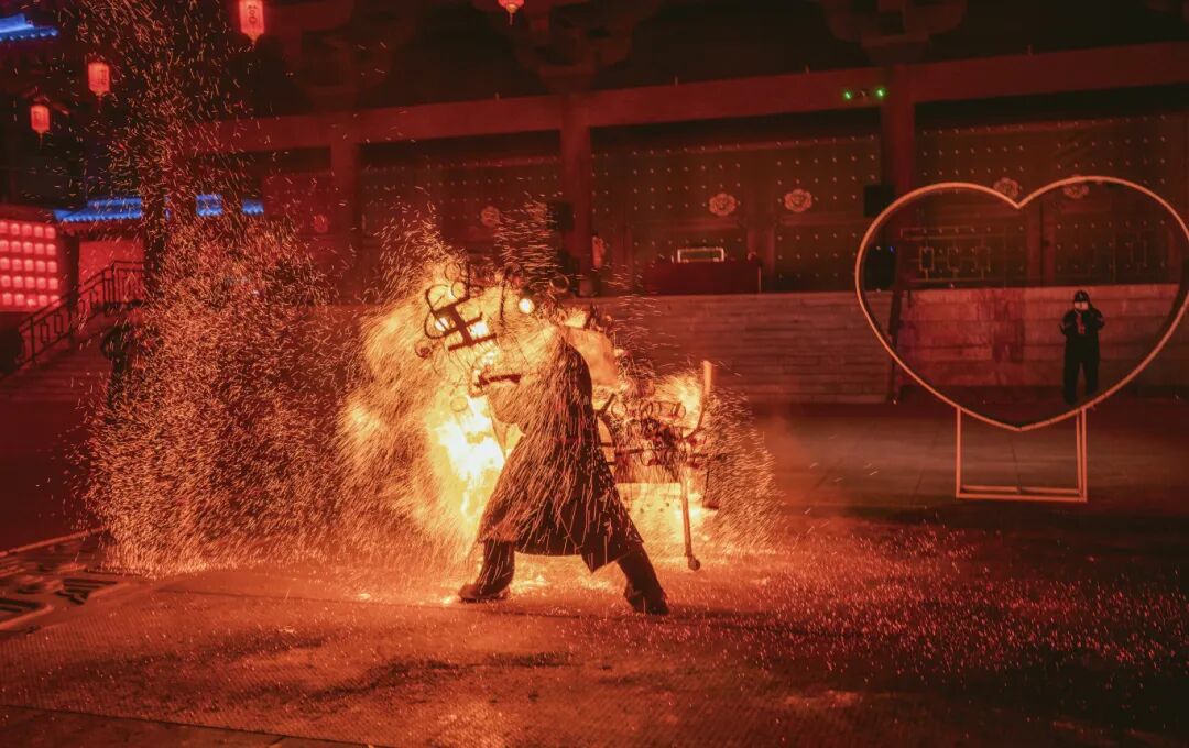 作为本次灯会的重头戏,非遗火秀在夜色中准时登场。非遗匠人执火献艺,带来一场集火刀、扇子火舞、火虎与打铁花于一体的震撼表演。