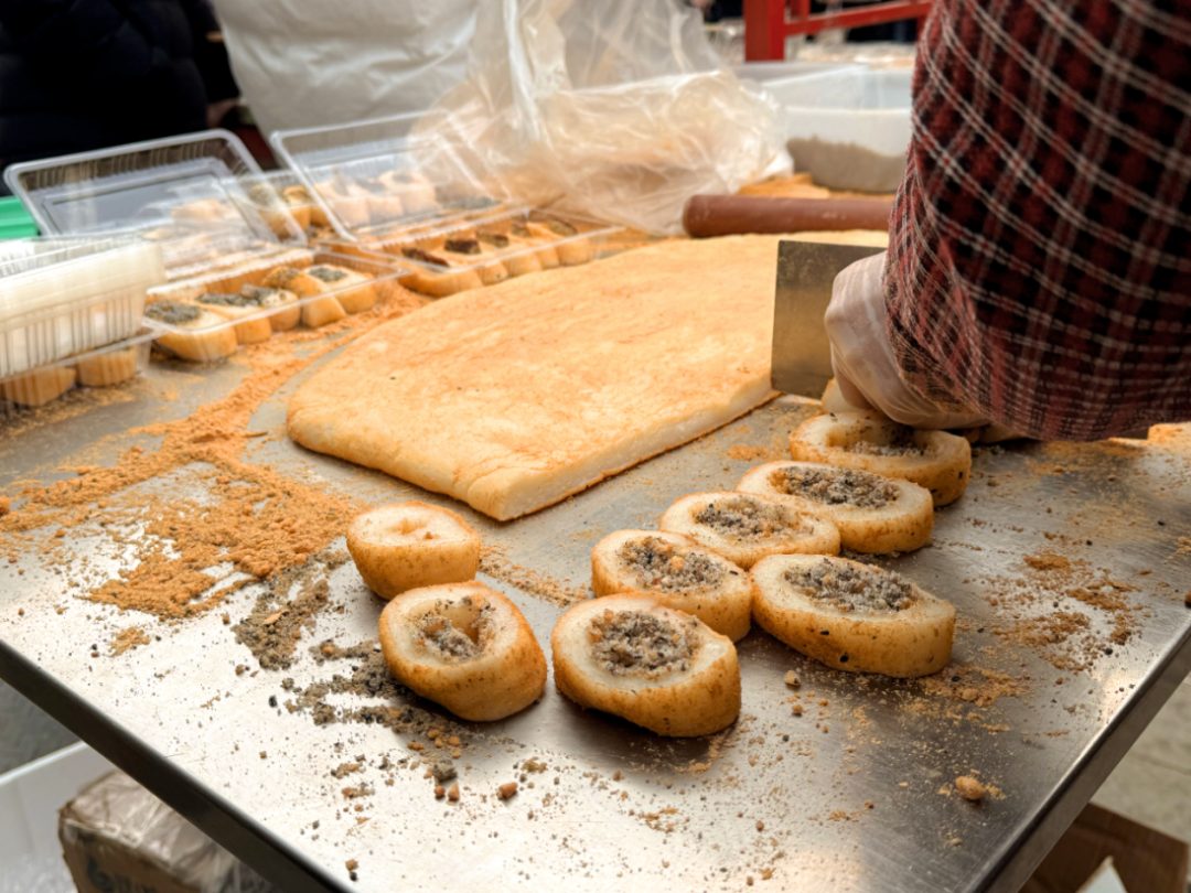 在莒国古城街边,各式美食热气氤氲、香气四溢,特色小吃、年味糕点、本地风味琳琅满目、一应俱全。
