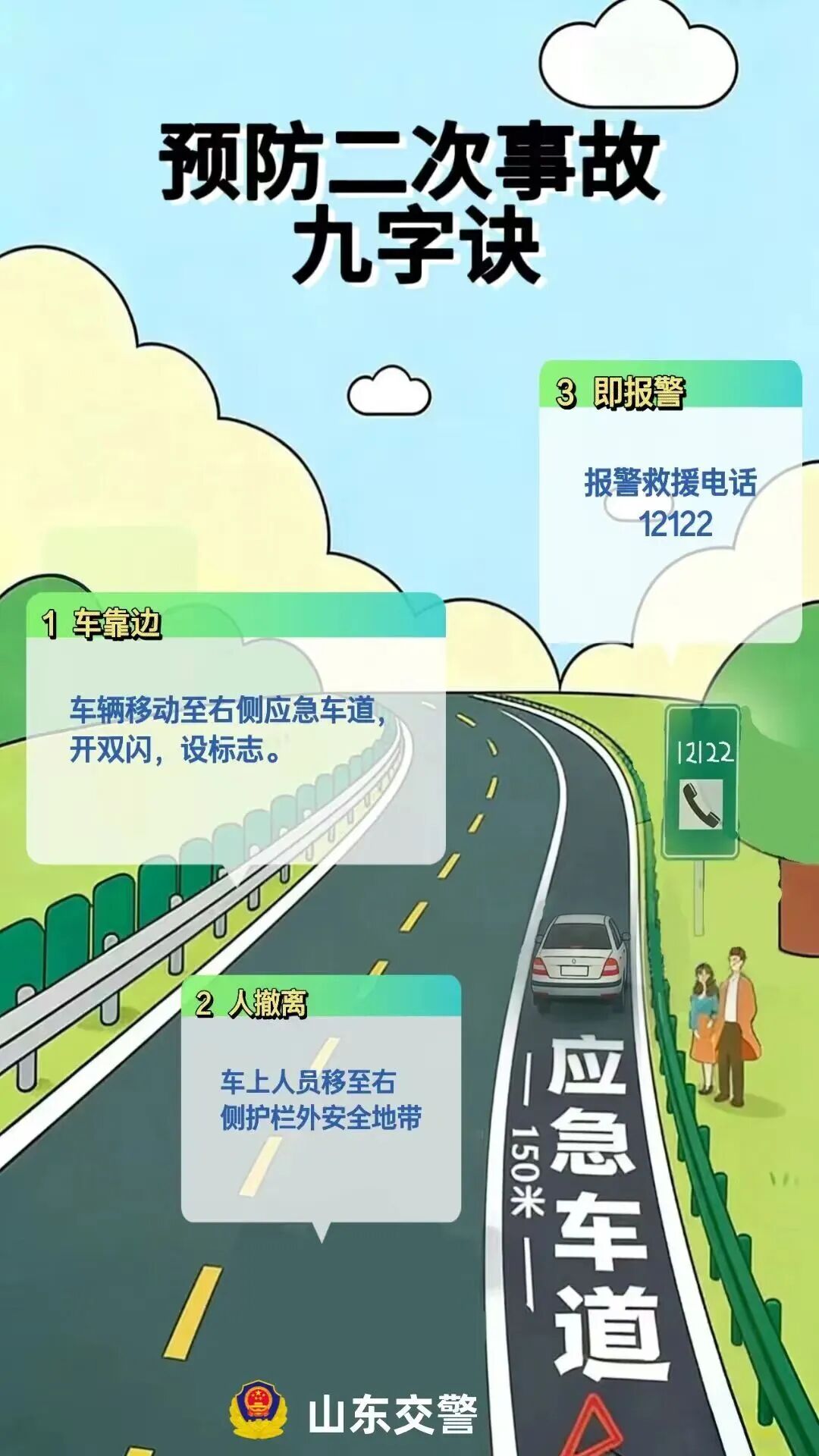 行经高速公路若发生故障或交通事故,谨记“车靠边、人撤离、即报警”九字警句。要立即开启危险报警闪光灯,在来车方向150米处摆放警告标志,车上人员迅速撤离至护栏外安全地点,拨打电话报警12122并等待救援,避免发生二次事故。
