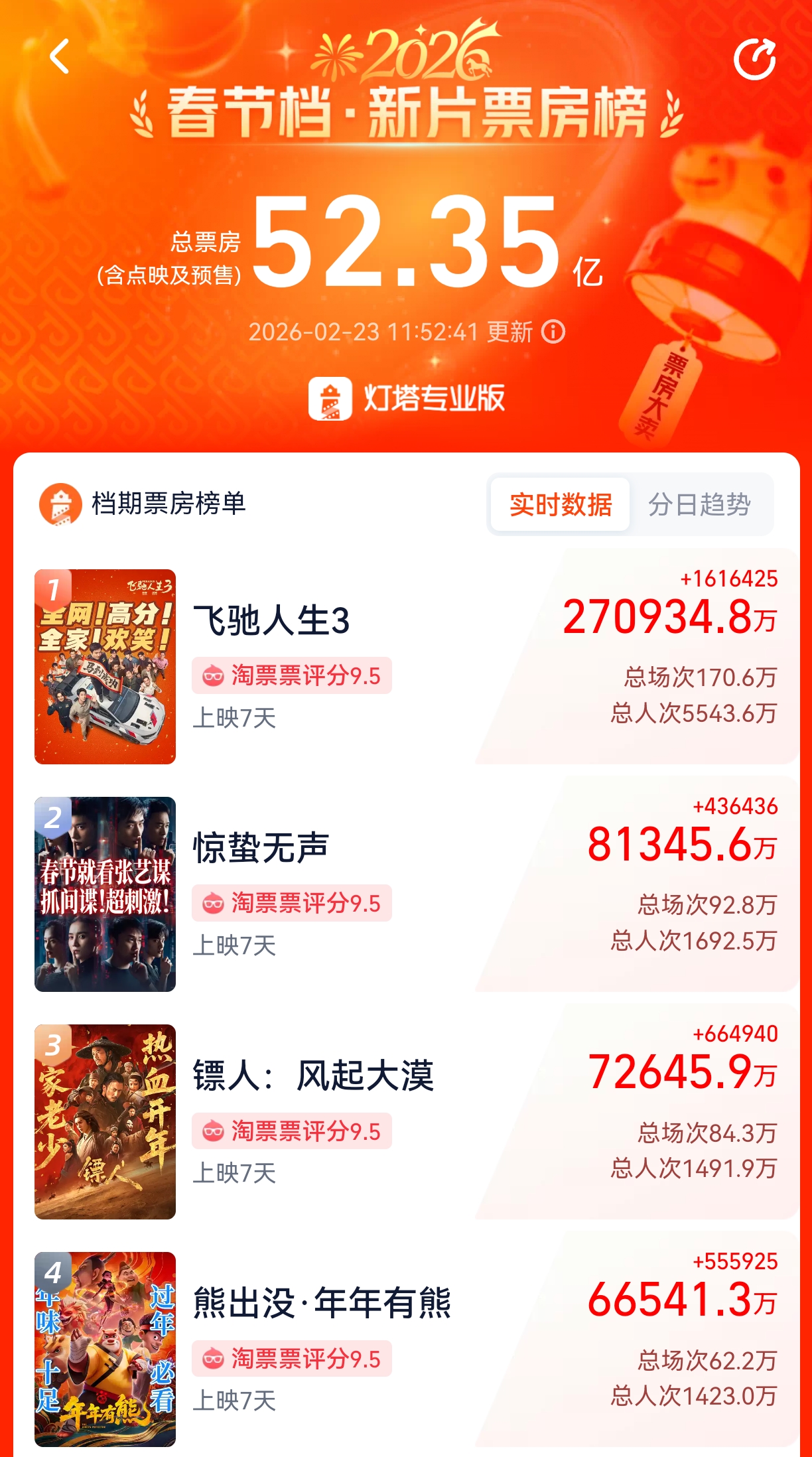 长假期间,国内消费市场交出亮眼成绩单,为A股节后走势提供坚实基本面支撑。据灯塔专业数据,截至2月23日11时45分,2026年春节档总票房突破52亿元,《飞驰人生3》以超27亿元票房领跑,影视院线板块景气度高涨。