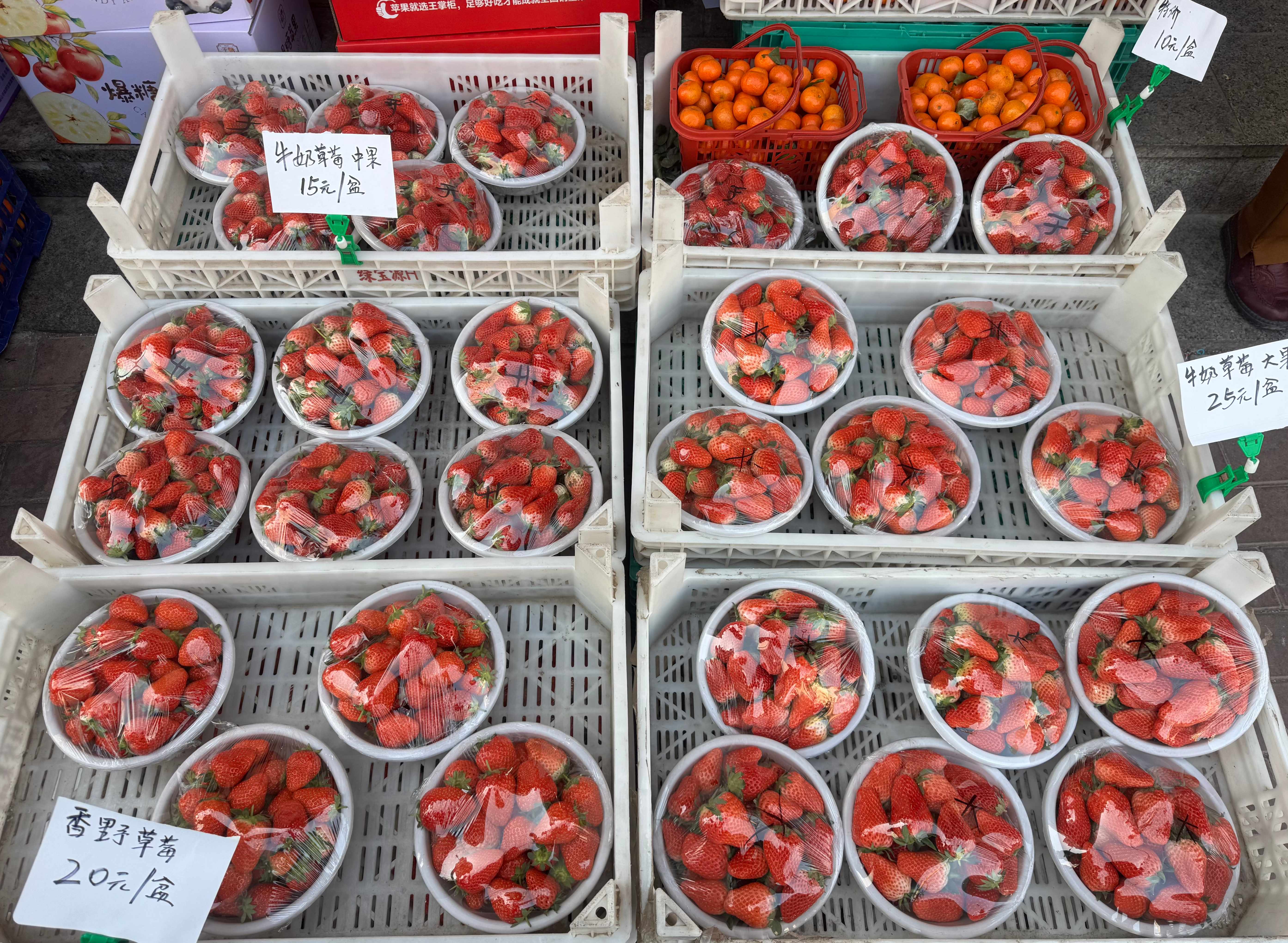 记者先后走访了多家社区水果店和大型商超后发现,春节前后随着本地大棚草莓集中上市,市场供应趋于充足,如今市场均价已回落至20-30元左右,部分本地品种甚至低至12元一斤。目前市场上草莓主要有散装和盆装两种售卖方式,散装价格一般在 15-20元/斤,部分小果或中果可能低至12-15元/斤。盆装或盒装价格因包装和规格不同,大致在 16-25元/盆(约1斤),大果或精品盆装可能达到30元/盆。
