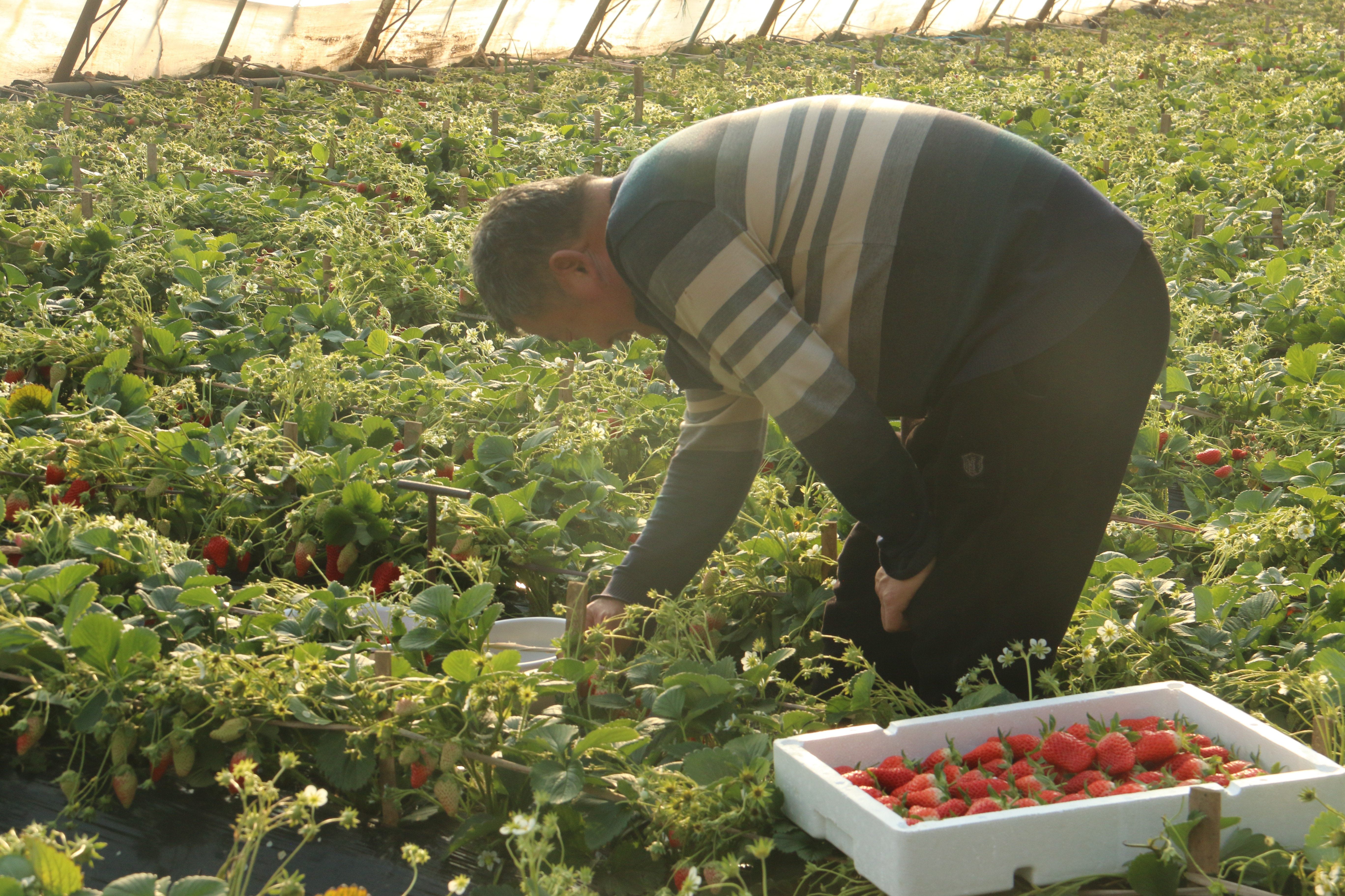 (老张正忙着采摘当天成熟的草莓 记者摄)